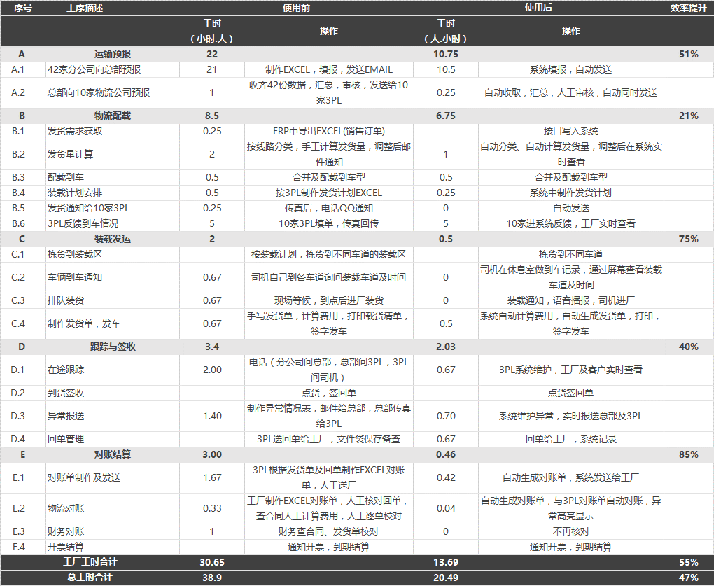 項目的實施讓貨主企業和物流企業均實現了各自內部的信息化建設,同時還為供應鏈物流的協同應用提供了完善的解決方案,這對物流的上游和下游都是一次重要的管理提升,甚至會成為企業核心競爭優勢的質的飛躍;
