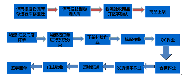 3.第三方物流配送庫按卸貨、收貨、上架、信息轉單、補貨、揀配、QC、合板、發貨等倉庫業務流程進行操作;