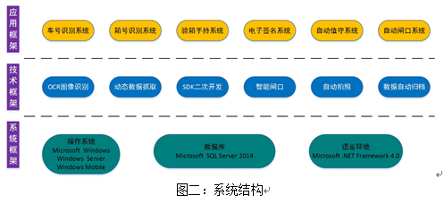 該系統(tǒng)由圖像采集終端, 數(shù)據(jù)處理中間件,以及圖像處理軟件組合形成,在集裝箱通過時,通過預(yù)設(shè)數(shù)據(jù)采集區(qū)域,自動獲取集裝箱箱號、箱型等信息,并將相關(guān)數(shù)據(jù)上傳至數(shù)據(jù)庫待前臺程序調(diào)用,并將相關(guān)照片上傳至指定網(wǎng)絡(luò)位置進行分類存儲。