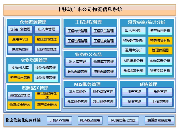 中國移動作為通信行業的一家大型上市央企,近幾年在來自資本市場的巨大壓力下,致力于通過開展企業管理信息化的探索,支撐公司高效低成本運營。在物流領域,中國移動按照標準化、集中化和信息化的思路,目前在總部和各省市分別設立了負責集中物流工作的機構,建立了相應的工作流程和制度。