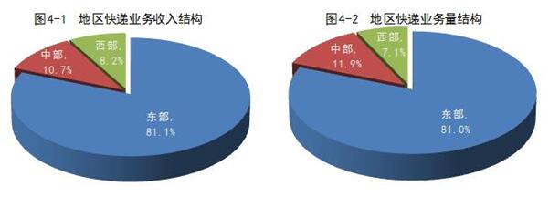 1-10月份,東、中、西部地區快遞業務收入的比重分別為81.1%、10.7%和8.2%,業務量比重分別為81%、11.9%和7.1%。與去年同期相比,東部地區快遞業務收入比重下降了0.7個百分點,快遞業務量比重下降了0.9個百分點;中部地區快遞業務收入比重上升了0.4個百分點,快遞業務量比重上升了0.7個百分點;西部地區快遞業務收入比重上升了0.3個百分點,快遞業務量比重上升了0.2個百分點。