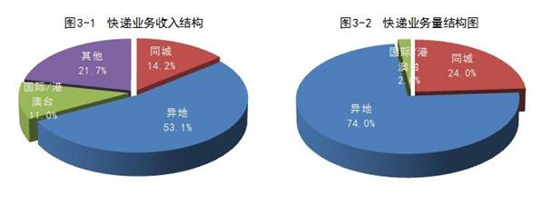 1-10月份,同城、異地、國際/港澳臺快遞業務收入分別占全部快遞收入的14.2%、53.1%和11%;業務量分別占全部快遞業務量的24%、74%和2%。與去年同期相比,同城快遞業務收入的比重下降0.3個百分點,異地快遞業務收入的比重下降1.5個百分點,國際/港澳臺業務收入的比重下降2.8個百分點。