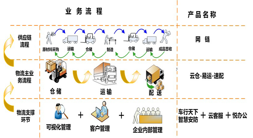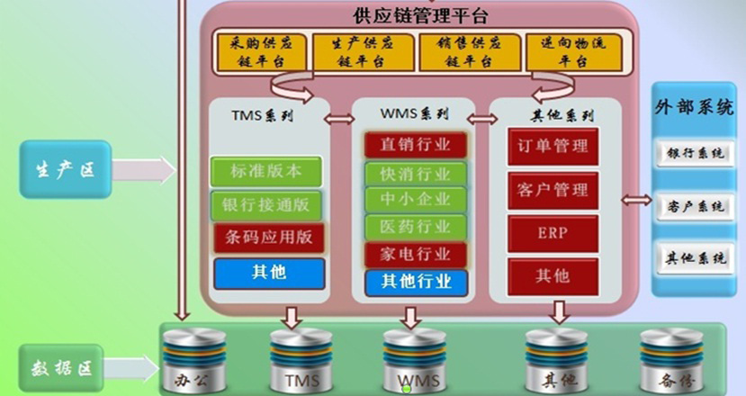供應鏈平臺主體分為采購、生產、銷售、逆向物流四部分,為了實現其信息化的應用,我們在此基礎上開發了TMS系統和WMS系統兩大核心產品分別用于物流運輸管理功能與物流倉儲管理功能。