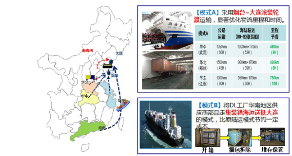 在此基礎上,項目組確定建立以調達物流的循環取貨為基礎、公路運輸與近海滾裝輪船聯運的聯運模式,進行生產用零部件批量調達取貨運輸。