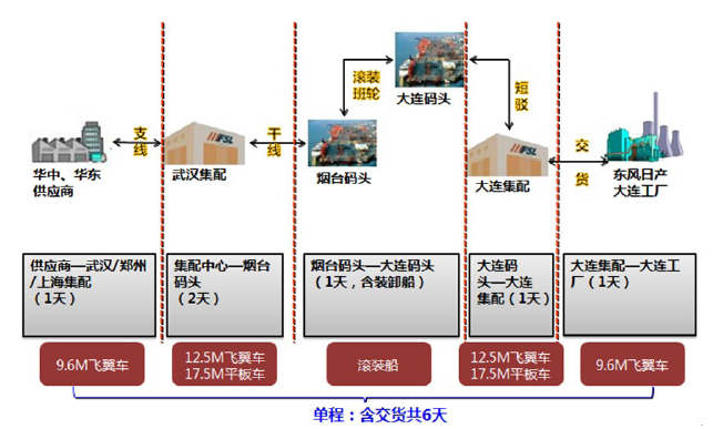 作為東風日產“北上”戰略的重要布局,大連工廠與現有的廣州、襄陽、鄭州三大生產基地實現了東風日產南北縱橫全新格局。首款P32R車型是作為平衡車型在大連、鄭州兩地生產,供應商多數落戶在華北、華東地區,迫切需要解決從南方向大連長途運輸的課題,而且需要盡可能削減長途運輸帶來的昂貴調達物流費用。同時,大連工廠地處大連保稅區,如何充分利用便利的海運物流條件,實現南北海運對流降低成本成為了工廠投產前重要的創新課題。