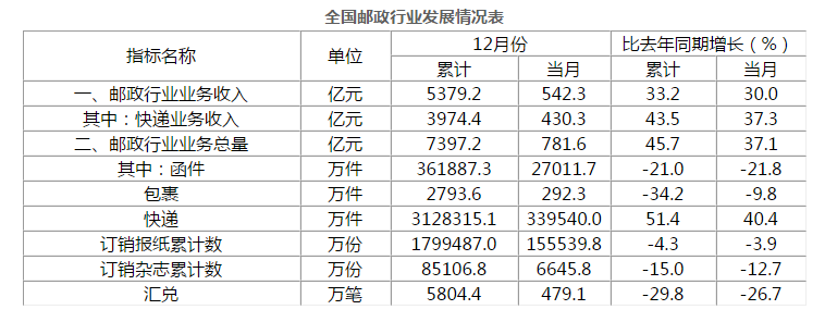 12月份,全行業(yè)業(yè)務(wù)收入完成542.3億元,同比增長(zhǎng)30%;業(yè)務(wù)總量完成781.6億元,同比增長(zhǎng)37.1%。