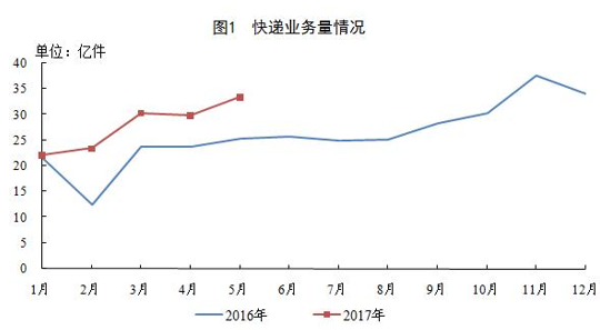 5月,全國快遞服務企業業務量完成33.4億件,同比增長32%;業務收入完成407.4億元,同比增長28.7%。