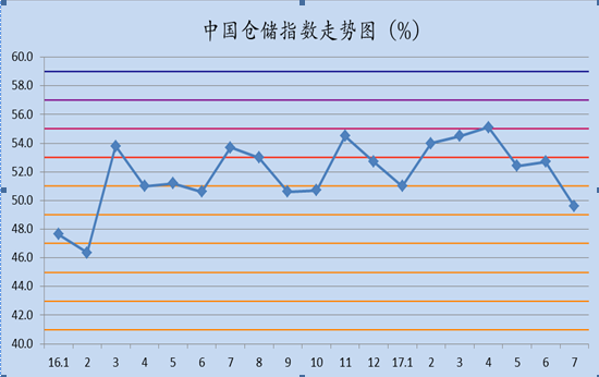 中國物流與采購聯合會與中儲發展股份有限公司聯合調查的2017年7月中國倉儲指數為49.6%,較上月回落3.1個百分點。各分項指數中,延伸業務量指數、設施利用率指數、業務活動預期指數較上月有所回升,其余指數均有不同程度的回落。