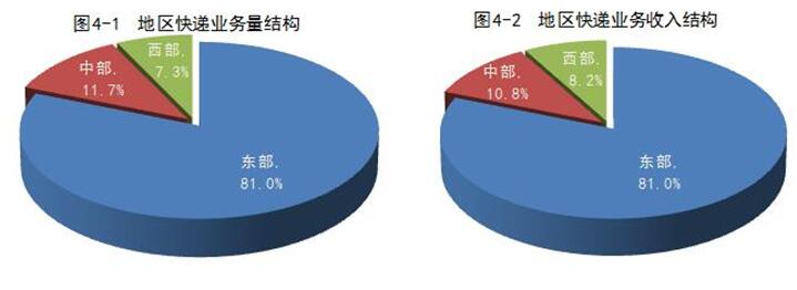 1-8月,東、中、西部地區快遞業務量比重分別為81%、11.7%和7.3%,業務收入比重分別為81%、10.8%和8.2%。與去年同期相比,東部地區快遞業務量比重下降了0.1個百分點,快遞業務收入比重下降了0.2個百分點;中部地區快遞業務量比重下降了0.1個百分點,快遞業務收入比重上升了0.1個百分點;西部地區快遞業務量比重上升了0.2個百分點,快遞業務收入比重上升了0.1個百分點。