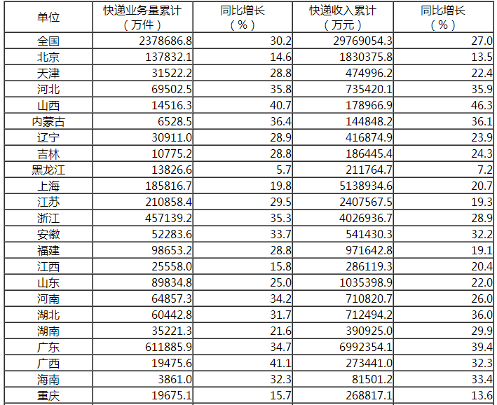 8月,全國快遞服務企業業務量完成32.6億件,同比增長29.4%;業務收入完成404億元,同比增長27.2%。