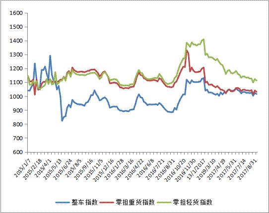 各車型指數波動幅度較小但均有同程度回落,零擔指數回落幅度略高于整車指數。其中,整車指數為1015.3點,比上周回落0.76%,比上年同期增長10.9%;零擔輕貨指數為1112.3點,環比回落0.87%;零擔重貨指數為1031.2點,環比回落0.92%。