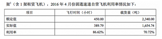 航空運(yùn)輸成本取決于飛機(jī)的利用率,影響因素有起飛架次、航線距離、載重量等。截止去年發(fā)布招股書時(shí),圓通公布有四條定期航線:杭州-北京/成都/西安、深圳-成都,四條航線飛行時(shí)間均為兩小時(shí)上下。招股書顯示,2016年4月自營(yíng)飛機(jī)3架(1架租賃)的利用率情況如下: