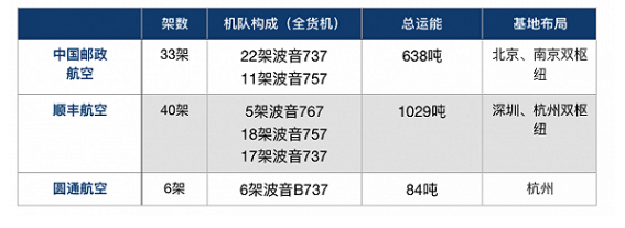 從機(jī)型選擇上來看,目前貨航的虧損原因是供大于求,市場(chǎng)上大飛機(jī)過剩,而缺30-60噸載量的中型貨機(jī),截止目前順豐航空、郵政航空和圓通航空的自用航空運(yùn)力構(gòu)成如下: