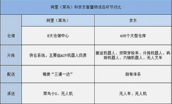 從上面的對比不難看出,主打物流平臺的菜鳥,在建設倉儲中心的同時,可以借助合作伙伴“三通一達”已有的中轉站,形成多點覆蓋網絡。而在配送和派送上,采取眾包式的菜鳥主要負責挖掘大數據信息,為各大倉儲中心間的物流調度作出最優的選擇。所以,菜鳥要做的是關鍵點和關鍵技術,它不必在全國范圍內廣泛布局,也不必對配送機器人和無人機進行大規模量化。而京東走的是自建物流體系,倉儲建設上肯定比菜鳥要下更大力氣,在無人車和無人機發展的要求和需求上也比菜鳥更強烈。