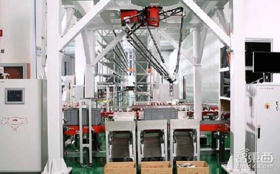 ▲京東無人倉內六軸機器手臂在碼放貨物,右側貨架由Shuttle貨架穿梭車負責搬運
