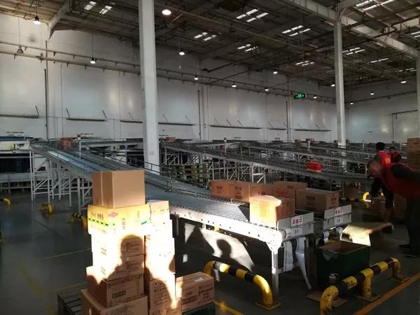 上游供應商帶板運輸到配送中心,倉內叉車直接卸貨,沒有驗收環節只有抽檢動作。根據門店訂單要求,能夠整托運走的,貼上一個整托碼,直接上車;也有一些門店比較小,每天的訂單量達不到一個SKU一托貨,倉配中心就將供貨商送來的整托貨拆除纏繞膜,按箱貼標簽,投放入分揀線,分揀線根據門店訂單分揀出所需商品數量,按批次滑入一條運輸路線上。