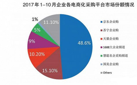 《中國企業電商化采購發展報告(2017)》顯示,從其取樣的覆蓋對行業的上千家企業來看,京東企業購以48.6%的市場份額占據半壁江山,穩居第一名,而處于第二名的蘇寧易購才僅有15.1%的市場份額,天貓企業購也只有10.2%的市場份額。