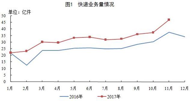 11月,全國快遞服務企業業務量完成47.1億件,同比增長25.2%;業務收入完成565.5億元,同比增長21.8%。