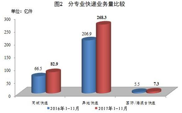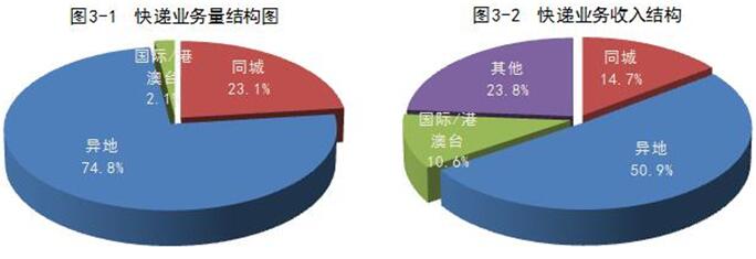 1-11月,同城、異地、國際/港澳臺快遞業務量分別占全部快遞業務量的23.1%、74.8%和2.1%;業務收入分別占全部快遞收入的14.7%、50.9%和10.6%。與去年同期相比,同城快遞業務量的比重下降0.7個百分點,異地快遞業務量的比重上升0.6個百分點,國際/港澳臺業務量的比重上升0.1個百分點。