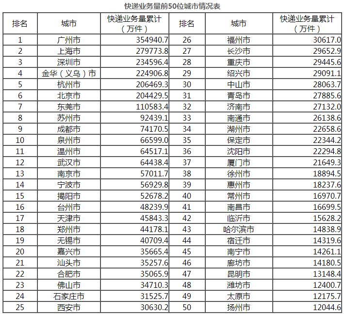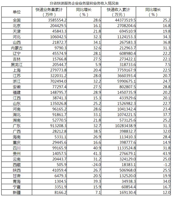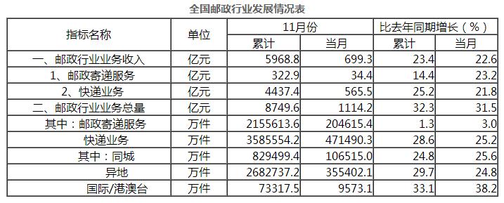 11月份,郵政服務業務總量完成159.6億元,同比增長32.9%;郵政寄遞服務業務量完成20.5億件,同比增長3%;郵政寄遞服務業務收入完成34.4億元,同比增長23.2%。