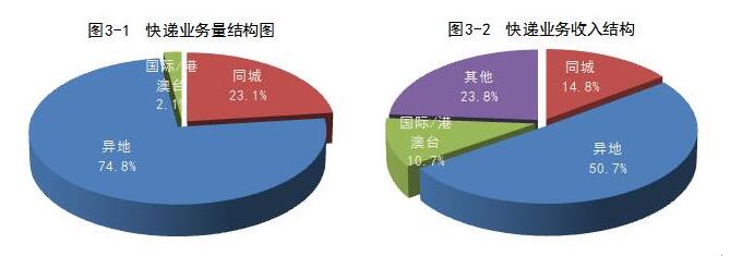 2017年,同城、異地、國際/港澳臺快遞業務量分別占全部快遞業務量的23.1%、74.8%和2.1%;業務收入分別占全部快遞收入的14.8%、50.7%和10.7%。與去年同期相比,同城快遞業務量的比重下降0.6個百分點,異地快遞業務量的比重上升0.5個百分點,國際/港澳臺業務量的比重上升0.1個百分點。