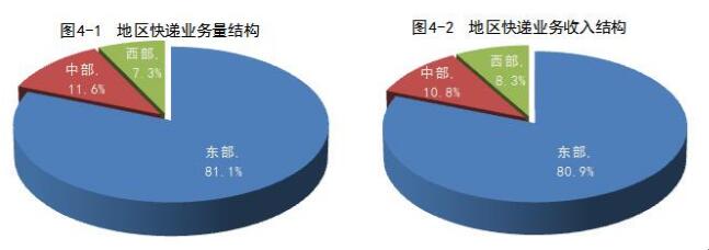 2017年,東、中、西部地區快遞業務量比重分別為81.1%、11.6%和7.3%,業務收入比重分別為80.9%、10.8%和8.3%。與去年同期相比,東部地區快遞業務量比重上升0.2個百分點, 快遞業務收入比重下降0.2個百分點;中部地區快遞業務量比重下降0.3個百分點, 快遞業務收入比重上升0.1個百分點;西部地區快遞業務量比重上升0.1個百分點,快遞業務收入比重上升0.1個百分點。