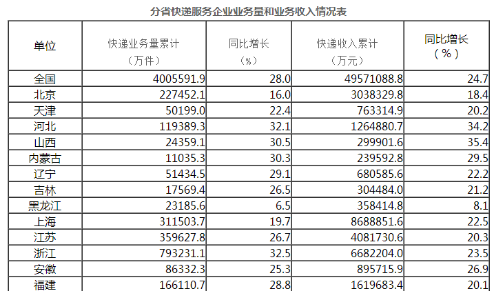 12月份,郵政服務業務總量完成159.1億元,同比增長30.4%;郵政寄遞服務業務量完成20.6億件,同比增長3%;郵政寄遞服務業務收入完成31億元,同比增長18.3%。