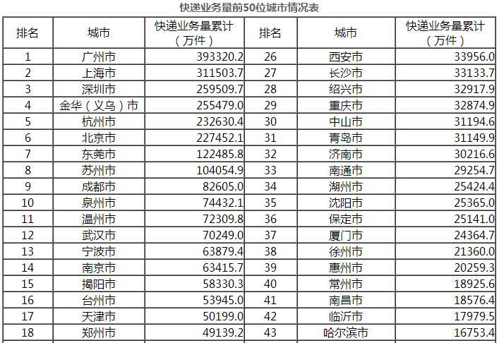 2017年,全國快遞服務企業業務量累計完成400.6億件,同比增長28%;業務收入累計完成4957.1億元,同比增長24.7%。其中,同城業務量累計完成92.7億件,同比增長25%;異地業務量累計完成299.6億件,同比增長28.9%;國際/港澳臺業務量累計完成8.3億件,同比增長33.8%。