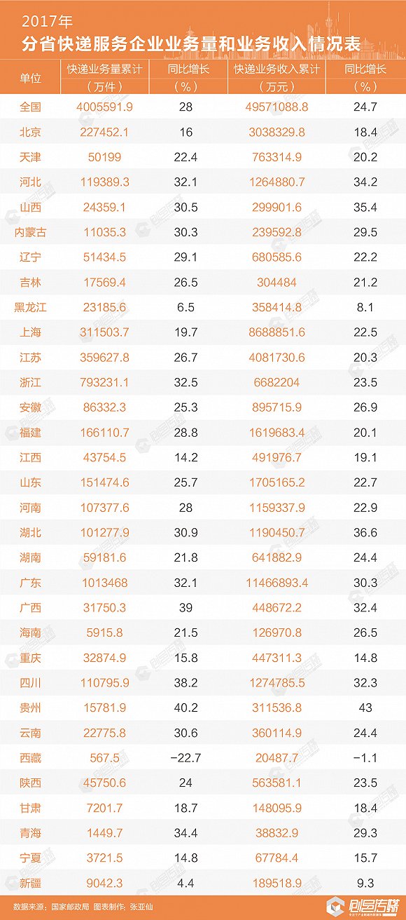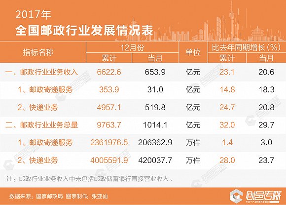 13日,記者從國家郵政局網(wǎng)站獲悉,國家郵政局公布2017年郵政行業(yè)運行情況。從公布的數(shù)據(jù)來看,2017年郵政行業(yè)的傳統(tǒng)業(yè)務(wù)進(jìn)一步萎縮,而快遞服務(wù)大幅增長。