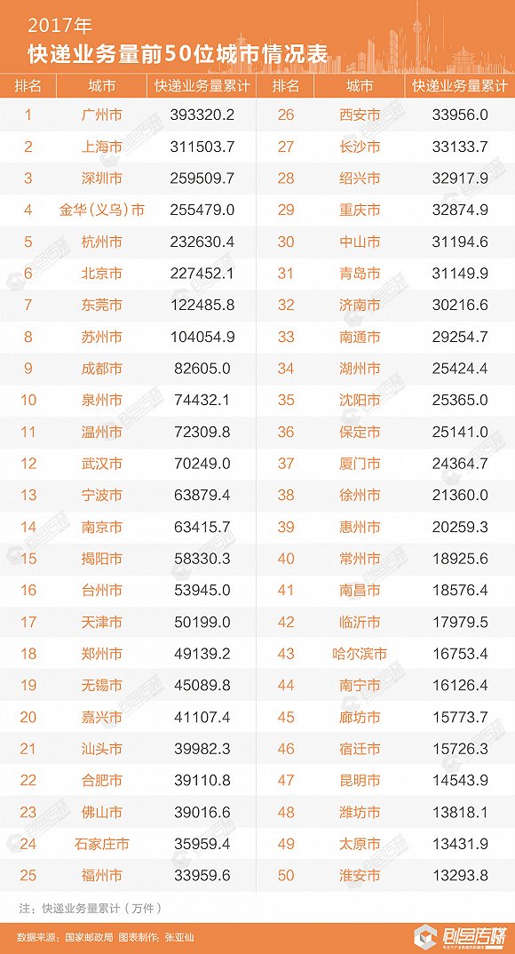 有意思的是,一些看似不起眼的三四線城市的郵政快遞量和快遞收入竟然比一線城市還要高,呈現(xiàn)出城市規(guī)模和快遞發(fā)達(dá)程度不一致的特點。例如,2107年快遞業(yè)務(wù)量前50位城市排行榜中,浙江金華(義烏)數(shù)據(jù)是255479萬件,排名第4位,快遞收入1577875萬元,排名第六,這兩項數(shù)據(jù)大大超越一線城市如重慶、大連、西安等;而作為一線城市直轄市的重慶相對應(yīng)的數(shù)據(jù)是32874萬件,排名29位;快遞收入447311萬元,排名19位。據(jù)人大社會研究中心的專家分析,其原因主要是,義烏作為中國小商品城的批發(fā)龍頭,是電商發(fā)源地之一,而且地處阿里巴巴所在地杭州附近,受到的輻射影響顯然比其他地方更強。早在2016年3月,義烏小商品城經(jīng)營戶就達(dá)70089個,全年成交額超千億元,為全球小商品市場最大。因此,其排名超過重慶也是在情理之中。