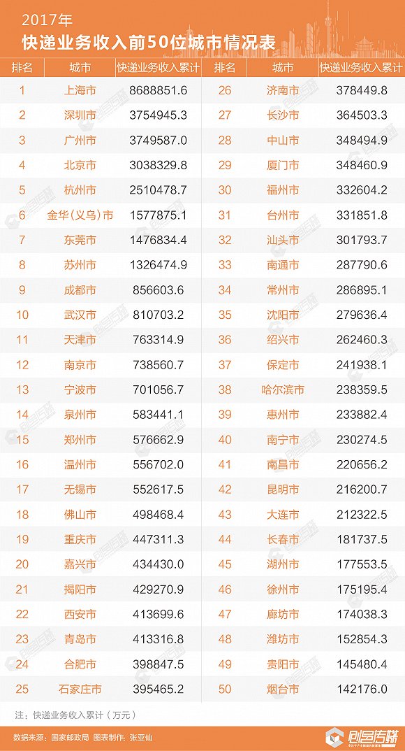 從城市來看,電商越是發(fā)達(dá)的地方,快遞業(yè)務(wù)也發(fā)達(dá)。2017年,快遞業(yè)務(wù)量前三位分別是廣州、上海和深圳??爝f收入前三位上海、深圳和廣州。基本上呈現(xiàn)東部城市好于西部城市,沿海城市強于內(nèi)陸城市等特征。