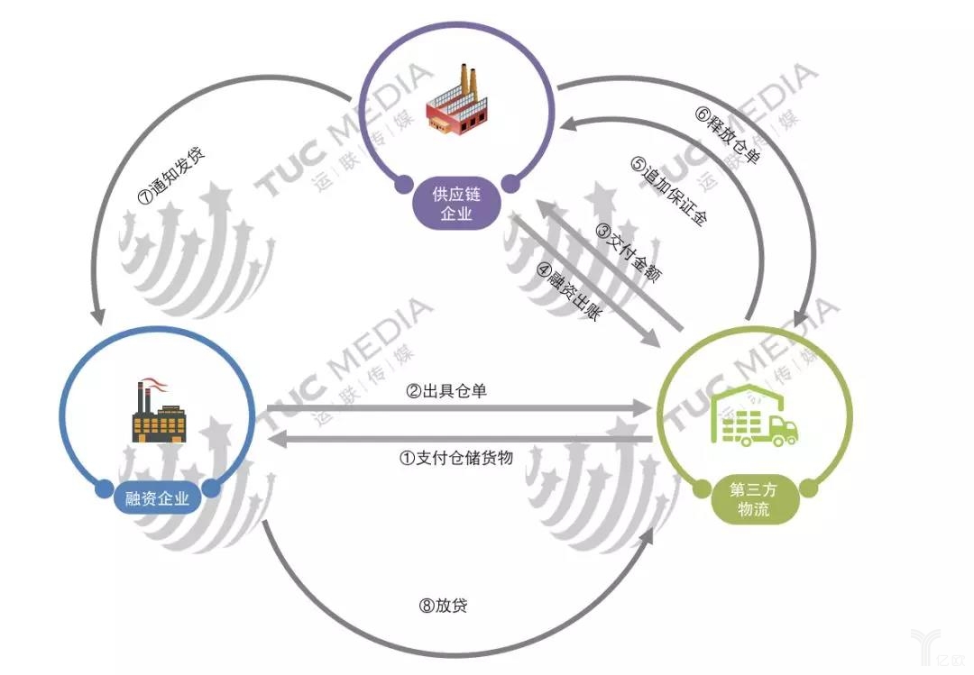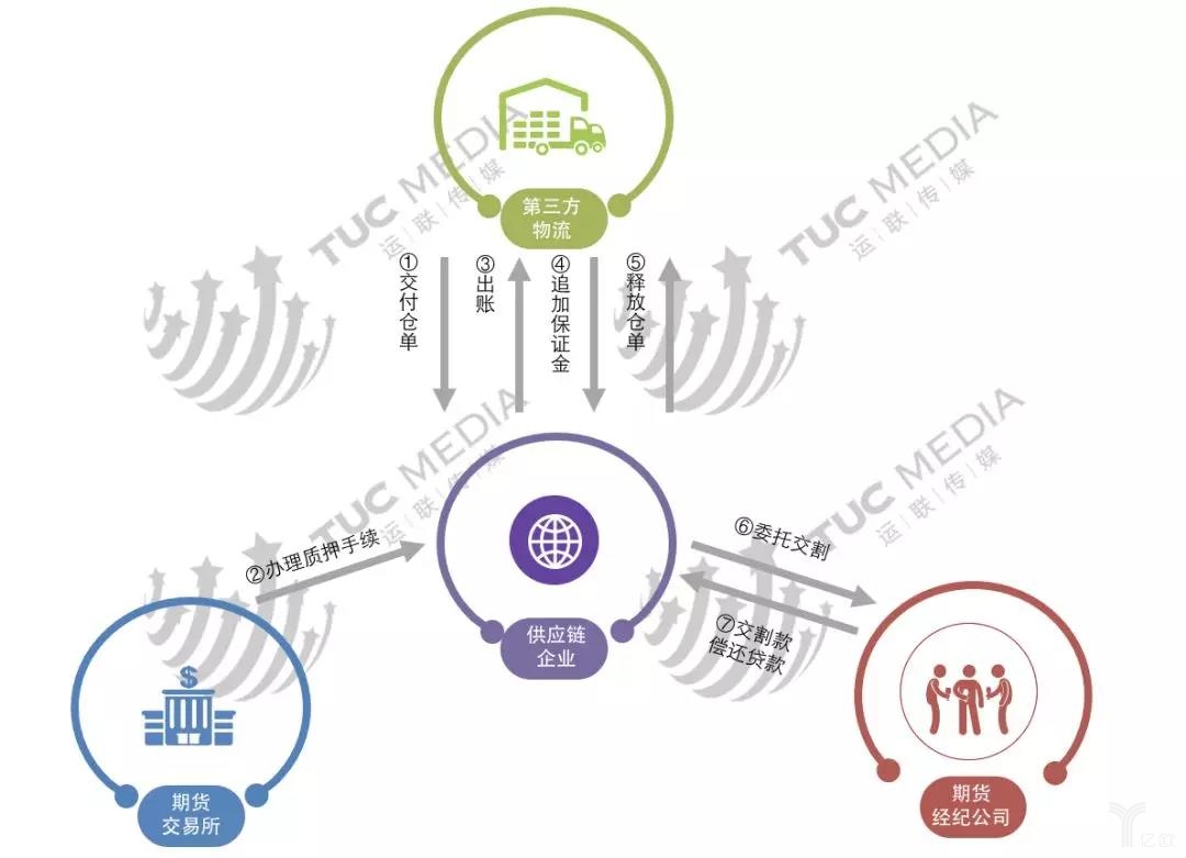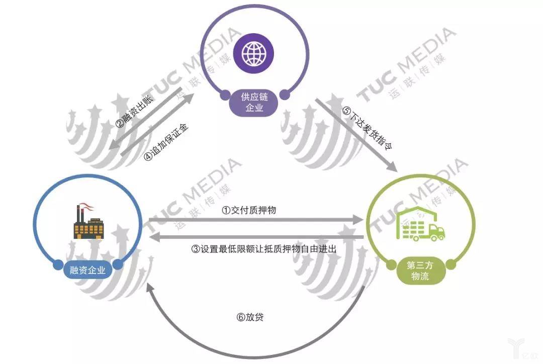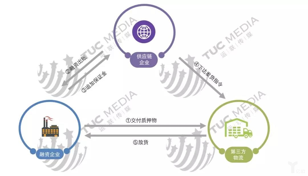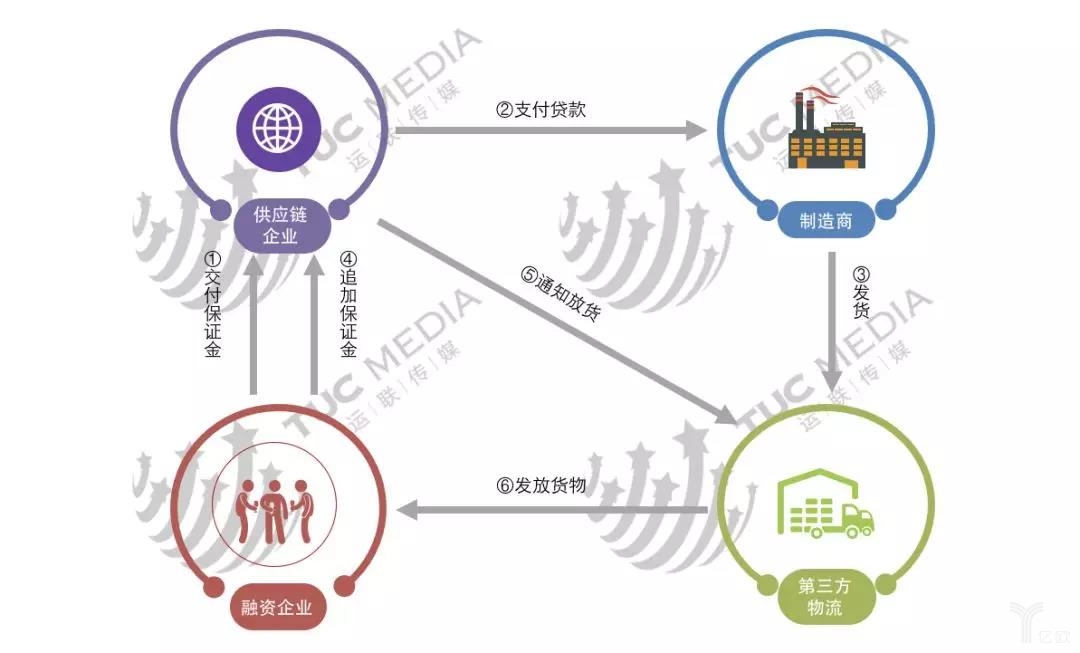 目前國內供應鏈貿易企業常用的方式為先票/款后貨貸款,其擔保的基礎為采購方對制造商的提貨權。供應鏈參與主體共同簽訂協議,供應鏈企業通過代付采購款方式對融資企業融資,第三方物流作為庫存貨的監管方對庫存進行監管。