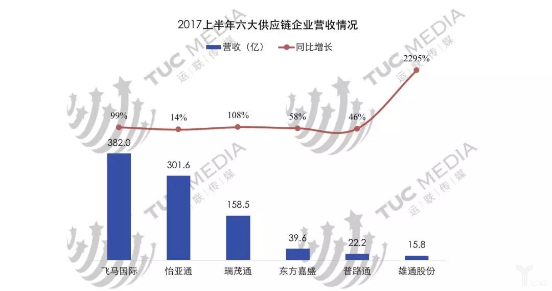 大型供應鏈企業以物流為基礎,深化“1+N”供應鏈模式,打造供應鏈金融生態,規模快速擴張。下圖為2017年上半年六大供應鏈企業營收情況: