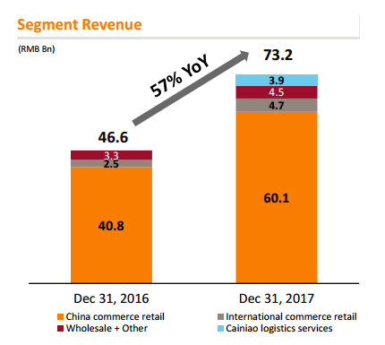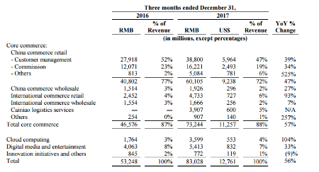 根據(jù)財(cái)報(bào)顯示,2018財(cái)年三季度,阿里核心電商業(yè)務(wù)收入達(dá)732.44億元,同比增長57%。其中,國內(nèi)零售業(yè)務(wù)實(shí)現(xiàn)營收601.05億元、國際零售業(yè)務(wù)實(shí)現(xiàn)營收47.33億元、批發(fā)及其它業(yè)務(wù)44.99億元、菜鳥物流服務(wù)39.07億元。
