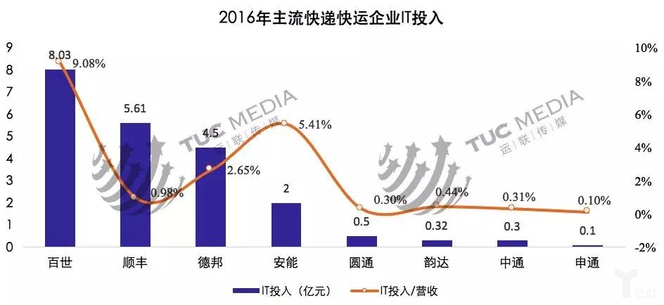全國性的快遞和快運公司在系統上頭投入重金,打造智能化的系統來支撐業務,但各自間的差異還是比較大的,百世、德邦、安能、順豐等在IT上的投入明顯高于通達系。