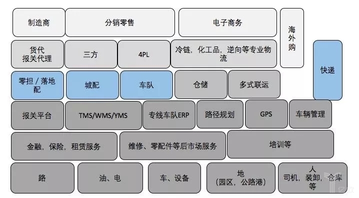 從上往下數第二層則是一些管理服務,比如我們聽到過的DHL、中外運等等,它們都屬于基礎的管理服務。