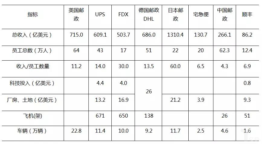 2016年,我國快遞業務收入為602億美元,僅為當年美國的1/4。從單個企業來看,日本郵政員工人均收入(營業收入/員工人數)最高,為中國郵政的員工人均收入15倍左右。收入差距之高與企業在人力和科技等要素投入有關。綜合實力的較量已經成為企業未來發展的關鍵,強大的航空和陸上運力資源、大規模的配送網絡和中轉中心,擁有整合其他物流網絡的能力以及在業務區域內快速有效的通關能力,輔以先進的實時跟蹤和運營控制計算機技術,才能在這一領域立足。順豐2016年在科技方向投入僅為UPS的1/5,日本郵政在廠房和土地方面的投入為順豐的2倍多,UPS的飛機數量為中國郵政的25倍,美國郵政的運輸車輛為順豐的14倍。我國郵政業雖然相對成熟的國外企業發展迅速,但企業綜合實力的提升才是未來競爭的關鍵。
