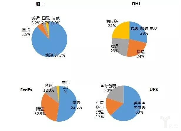 德國郵政DHL服務功能分配最均衡,UPS和FDX雖然都有綜合性物流業務但仍然偏重快遞業務。國內最先進的順豐,重貨、冷鏈、國際等新興業務占比僅為11.4%。