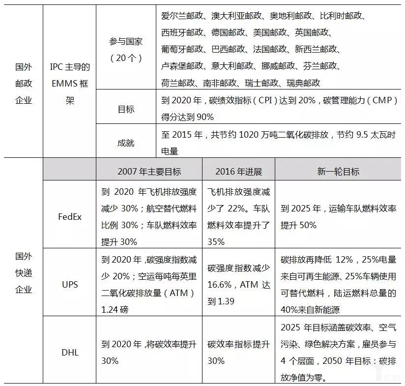 IPC于2008年設定環境監測和測量系統(EMMS)框架,目前已有20個國家的郵政企業參與,承諾到2020年,碳績效指標(CPI)達到20%,碳管理能力(CMP)得分達到90%。2014年,CPI指標提前完成目標,2015年CMP得分已達85%。其中,美國郵政、英國郵政等領軍企業還在建筑物能源審計、屋頂資產管理、物料采購政策等方面積極作為。三大國際快遞企業先后于2007年設定溫室氣體減排目標,提出2020年降低碳強度、提升碳效率、減少碳足跡等一攬子具體指標。經過持續努力,2016年三家企業都取得了階段性成就,并設定新一輪目標。