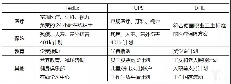 改善健康狀況的主要做法為提供完備的醫療保障、周密的意外保險、慷慨的帶薪休假方案等。UPS為員工提供的常規健康支持包括:醫療服務、牙科保健、視力保健、人壽保險、殘疾保險、旅行意外保險、稅前醫療支出和儲蓄賬戶等。提高福利水平的主要做法是關注雇員家庭、支持職業發展、股權激勵等。DHL共計為雇員子女提供了2000份獎學金,為4045名雇員提供了職業培訓資金。