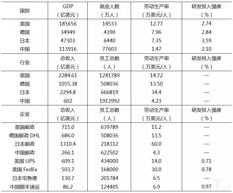 中美德日郵政業勞動生產率、研發強度及相關情況對比