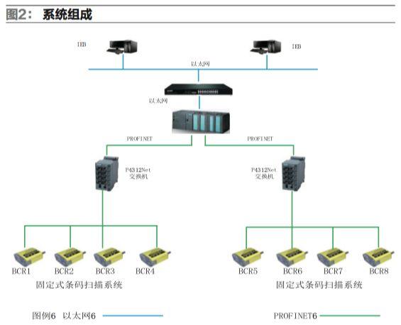 整個箱式物料自動輸送系統(tǒng)采用基于圖像識別的高性能條碼閱讀器作為信息采集終端(BCR),設備控制層采用可編程邏輯器件PLC作為主控制器,控制網絡采用PROFINET網絡架構,上位計算機系統(tǒng)與主控制器通訊,實現(xiàn)信息交互。整個系統(tǒng)組成如圖2。