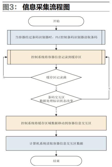 當箱式物料到達某個固定條碼閱讀器識讀點時,控制系統(tǒng)將觸發(fā)條碼閱讀器開始讀取條碼值,當PLC收到條碼信息后將讀碼設備編號、條碼信息、獲取條碼時間存入緩存區(qū)內。