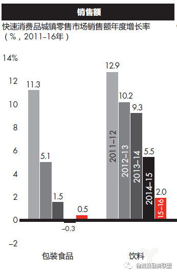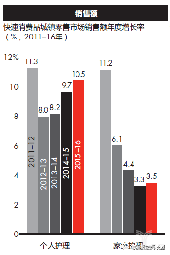 從消費內容看,消費支出從基礎生活類商品逐漸向耐用商品、綠色健康商品、智能商品、高端商品轉變。在快速消費品領域,根據凱度貝恩和凱度消費者指數研究《2017中國購物者報告(一)》中城鎮快速消費品的統計數據,盡管中國城鎮家庭數量一直穩定上升,但快速消費品品類增長普遍放慢。導致增速減慢的最根本原因是每個家庭在快速消費品上的平均支出增速放緩,2016年僅為0.7%,遠低于可支配收入的增速。特別在包裝食品和飲料市場,自2014年起持續走低。但是,在個人和家庭護理用品市場出現不同的趨勢,2016年個人護理和家庭護理用品的銷售額在2016年分別增長10.5%和3.5%,如圖3-2所示。這些品類都受益于中國消費者呈現的一些關鍵趨勢,例如對健康和保健的關注度不斷提升。