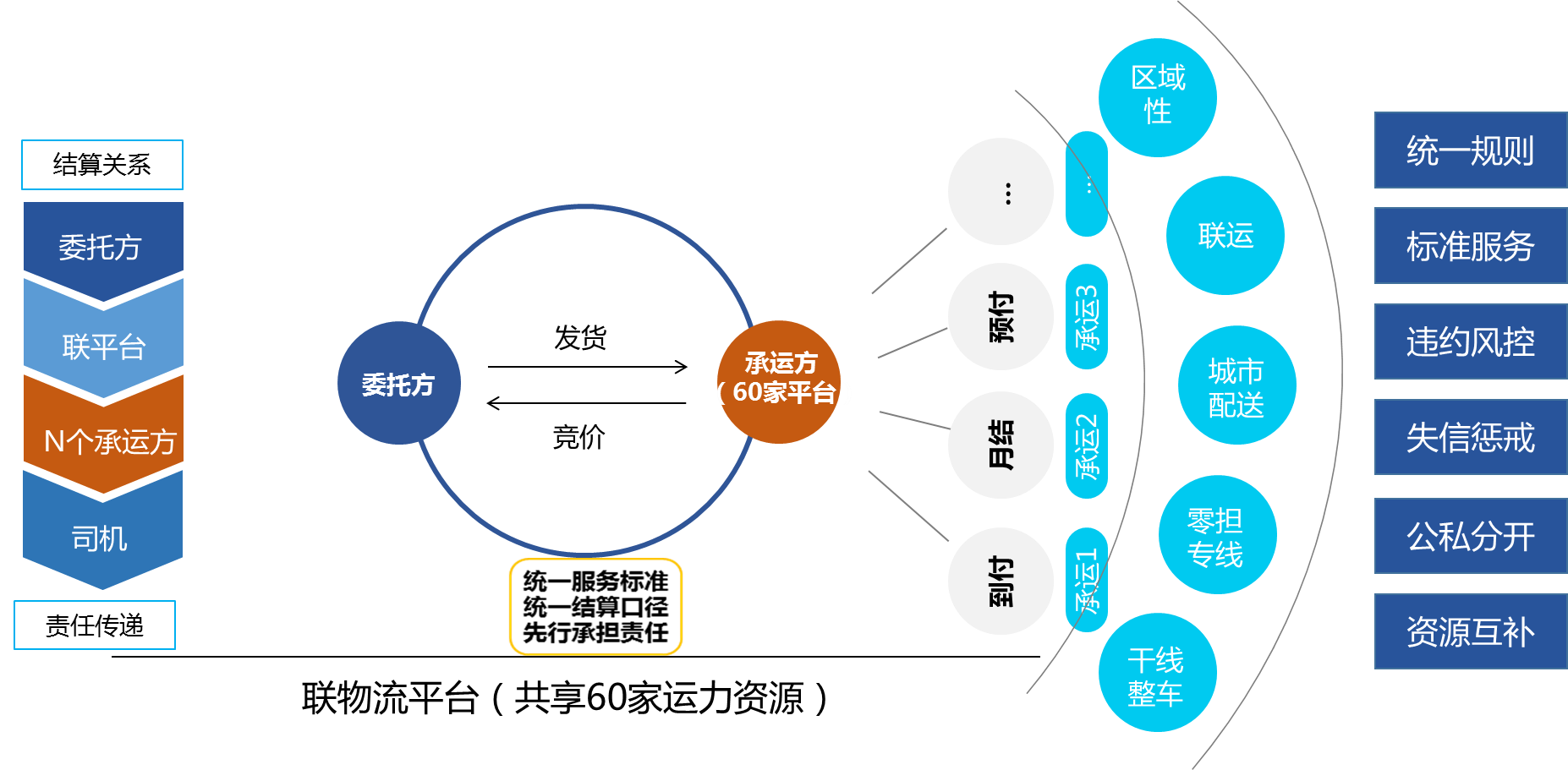 按照設(shè)置好的賬號信息,對合同物流以外的臨時物流發(fā)貨進(jìn)行平臺綁定,經(jīng)過精準(zhǔn)對接,幫助集團(tuán)企業(yè)聯(lián)接了聯(lián)物流平臺60家運(yùn)力平臺的4家對口平臺進(jìn)行搶單競價,保證資源補(bǔ)充及充分詢比價。聯(lián)平臺通過框架合同的方式統(tǒng)一運(yùn)力平臺的服務(wù)標(biāo)準(zhǔn)、違約賠償責(zé)任,傳遞責(zé)任,保證風(fēng)控,統(tǒng)一服務(wù),統(tǒng)一結(jié)算,減少原有模式的復(fù)雜操作。