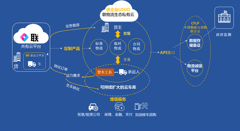 當(dāng)企業(yè)剝離物流業(yè)務(wù),形成社會化三方的物流企業(yè)進(jìn)行服務(wù)時,聯(lián)物流平臺將為集團(tuán)部署私有云平臺,借助私有云平臺,聚集貨源、整合車源,幫助企業(yè)成為平臺生態(tài)的聚合者、平臺商業(yè)模式的制定者、平臺上最具成本優(yōu)勢的承運(yùn)方。做到貨源私有、平臺私有、品牌私有、運(yùn)力私有、生態(tài)私有等。通過私有平臺建立平臺生態(tài),提供包括融資租賃、保險、金融、支付、加油、修車、集采等增值服務(wù),為企業(yè)創(chuàng)收。