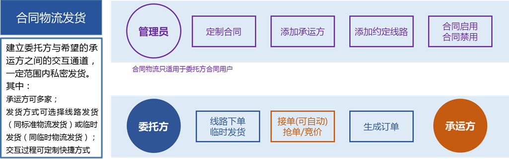 以在線化、流程化為目標(biāo),按照集團(tuán)現(xiàn)有的交易層級及流程進(jìn)行設(shè)計(jì)。各分公司與配貨站之間使用聯(lián)物流平臺合同物流的交易流程,分別將各分公司定向詢價的常用配貨站進(jìn)行一對多的合同綁定,建立專屬詢價通道,并對交易結(jié)果進(jìn)行展示和追溯,接收監(jiān)督。各分公司合同配貨站使用承運(yùn)方賬號,定向接收詢價信息,使用搶單競價機(jī)制,充分公平競爭。
