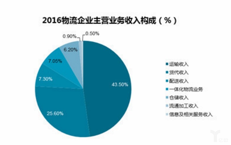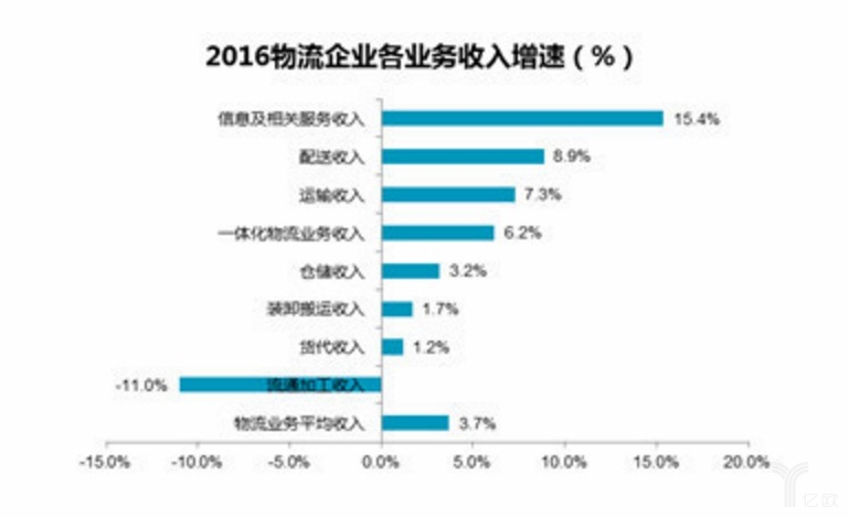 從2016年物流企業主營收入構成及增速來看,信息服務、一體化物流業務收入收入增長明顯,分別增長15.4%和6.2%,增速分別提高了23.6和2.9個百分點,顯示物流服務結構調整不斷推進,智能物流為第三方物流企業開辟了新的收入增長點。未來一體化物流業務、信息及相關服務將成為重要收入來源。