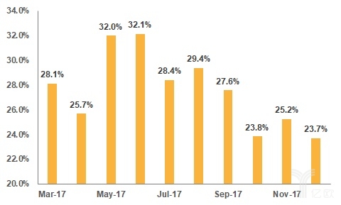 圖1:2017年快遞業(yè)逐月業(yè)務量增速(%)