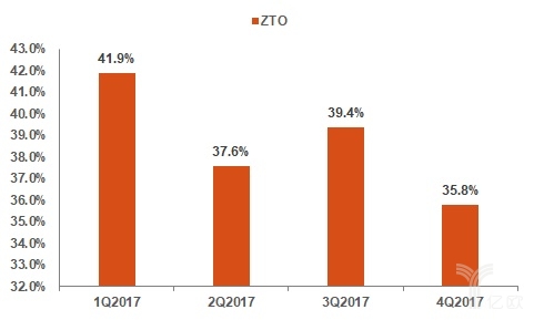 圖2:2017年中通快遞逐季包裹量增速(%)